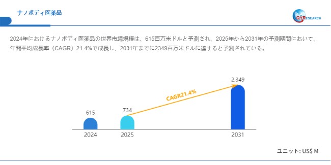 QYResearchが発表した新たな市場調査レポート「ナノボディ医薬品―グローバル市場シェアとランキング、全体の売上と需要予測、2026~2032」によると、世界のナノボディ医薬品市場規模は2024年の約615百万米ドルから2025年の734百万米ドルへと順調に拡大すると見込まれ、予測期間中は年平均成長率(CAGR)21.4%で成長し、2031年には2349百万米ドルに達すると予測されている。