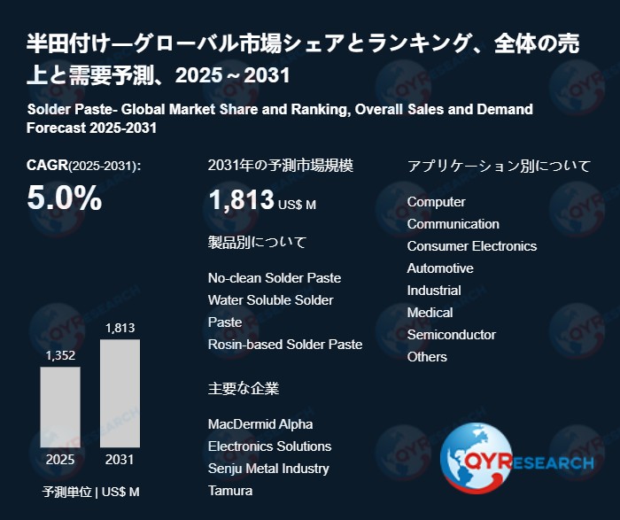QYResearchが発表した新たな市場調査レポート「半田付け―グローバル市場シェアとランキング、全体の売上と需要予測、2026~2032」によると、世界の半田付け市場規模は2024年の約1294百万米ドルから2025年の1352百万米ドルへと順調に拡大すると見込まれ、予測期間中は年平均成長率(CAGR)5.0%で成長し、2031年には1813百万米ドルに達すると予測されている。