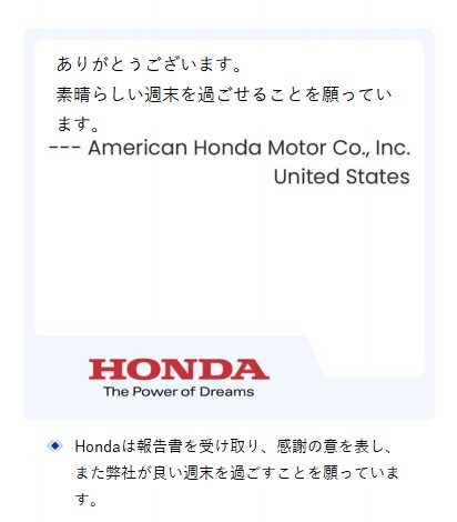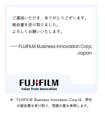 「ご連絡いただき、ありがとうございます。報告書を受け取りました。よろしくお願いいたします。」