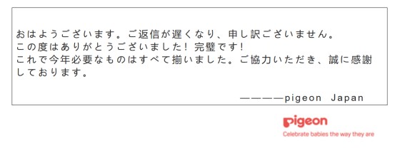「おはようございます。ご返信が遅くなり、申し訳ございません。この度はありがとうございました!完璧です!これで今年必要なものはすべて揃いました。ご協力いただき、誠に感謝しております。」