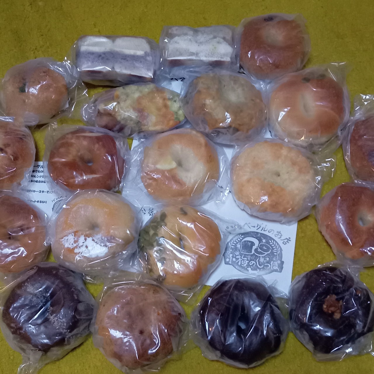 みんな違う種類のベーグルが16個、おまけのパンが4個入った宝箱でした。