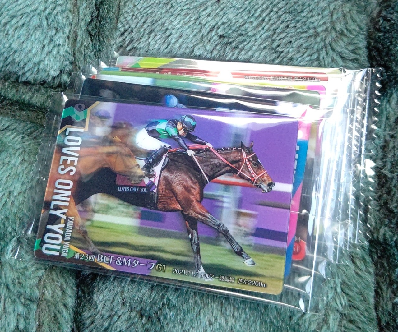 それと、アニメやゲームでよくあるウエハース、近ごろは競馬でも展開されてて人気のお馬さんがカード化されてたりするんですね(去年出たときはあっという間に品切れてあまり買えなかった記憶)。