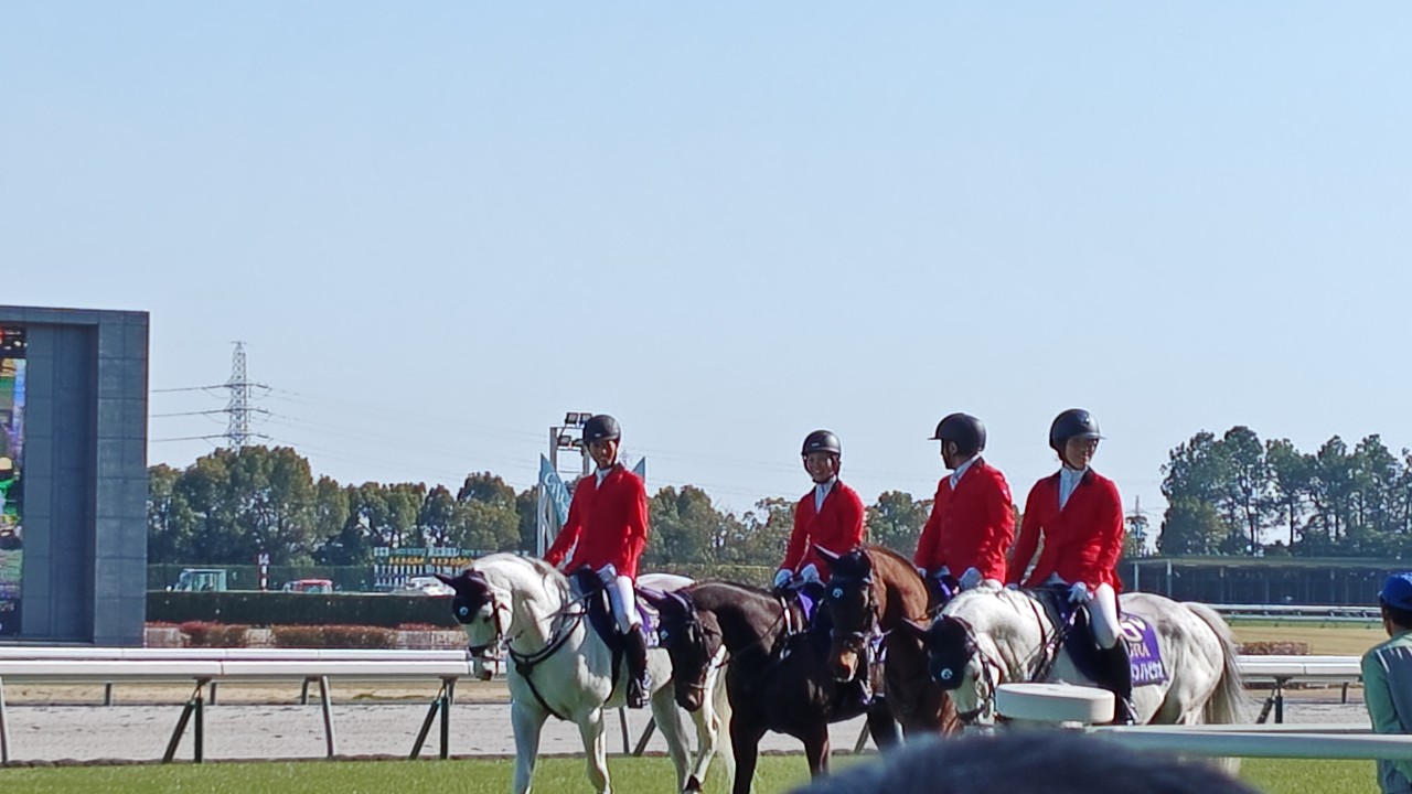 今回は指定席を取らなかった代わりに自由に場所を変えつつ見て回ってたんですが、ウィナーズサークルのすぐ手前で立ち見していたら誘導馬たちがすぐ近くまで寄ってきてびっくり!