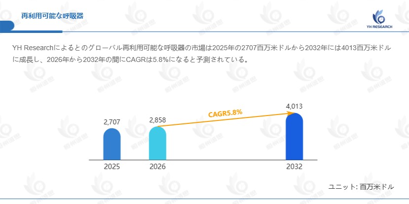 YH Researchによるとのグローバル再利用可能な呼吸器の市場は2025年の2707百万米ドルから2032年には4013百万米ドルに成長し、2026年から2032年の間にCAGRは5.8%になると予測されている。