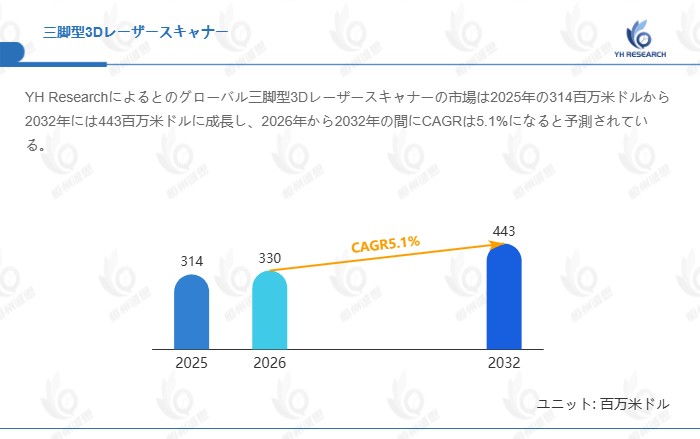 YH Researchによるとのグローバル三脚型3Dレーザースキャナーの市場は2025年の314百万米ドルから2032年には443百万米ドルに成長し、2026年から2032年の間にCAGRは5.1%になると予測されている。