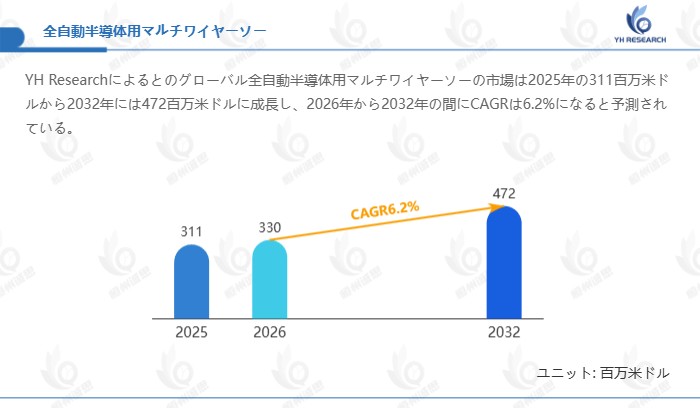 YH Researchによるとのグローバル全自動半導体用マルチワイヤーソーの市場は2025年の311百万米ドルから2032年には472百万米ドルに成長し、2026年から2032年の間にCAGRは6.2%になると予測されている。