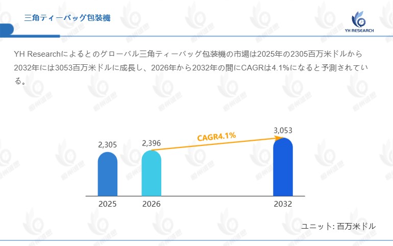 YH Researchによるとのグローバル三角ティーバッグ包装機の市場は2025年の2305百万米ドルから2032年には3053百万米ドルに成長し、2026年から2032年の間にCAGRは4.1%になると予測されている。