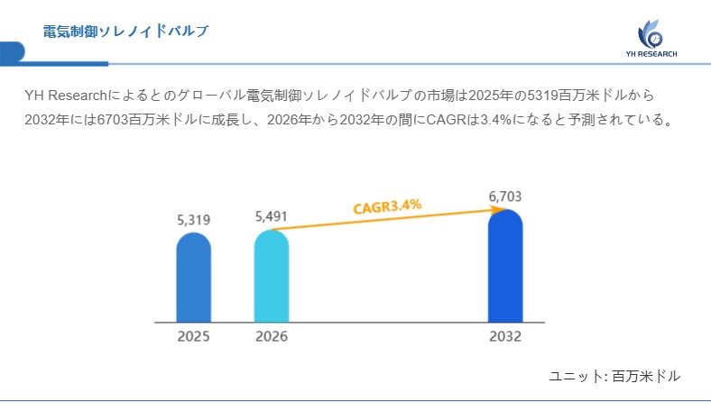 YH Researchによるとのグローバル電気制御ソレノイドバルブの市場は2025年の5319百万米ドルから2032年には6703百万米ドルに成長し、2026年から2032年の間にCAGRは3.4%になると予測されている。