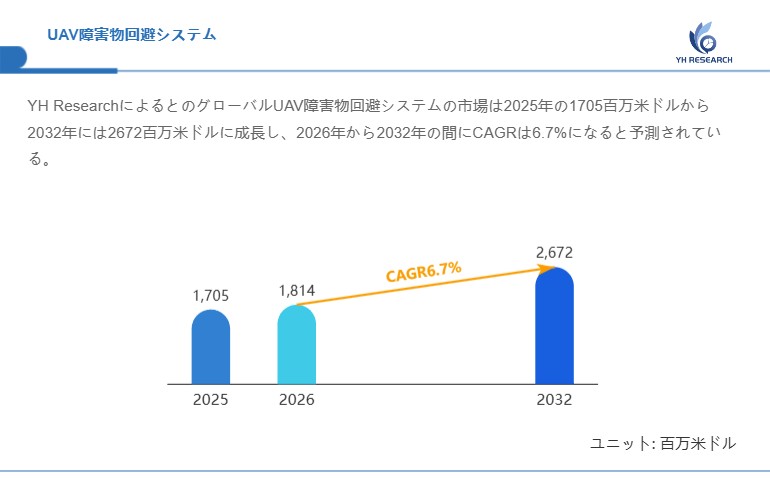 YH ResearchによるとのグローバルUAV障害物回避システムの市場は2025年の1705百万米ドルから2032年には2672百万米ドルに成長し、2026年から2032年の間にCAGRは6.7%になると予測されている。