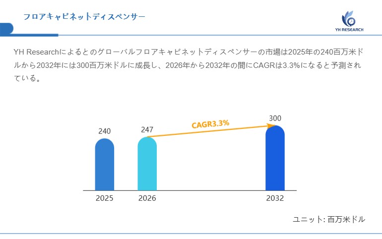 YH Researchによるとのグローバルフロアキャビネットディスペンサーの市場は2025年の240百万米ドルから2032年には300百万米ドルに成長し、2026年から2032年の間にCAGRは3.3%になると予測されている。