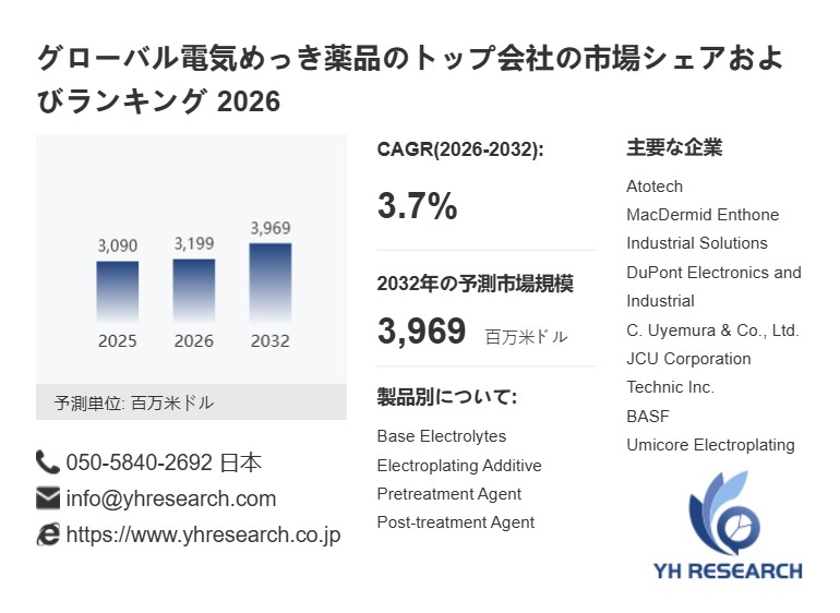 上記の図表/データは、YHResearchの最新レポート「グローバル電気めっき薬品のトップ会社の市場シェアおよびランキング 2026」から引用されています。