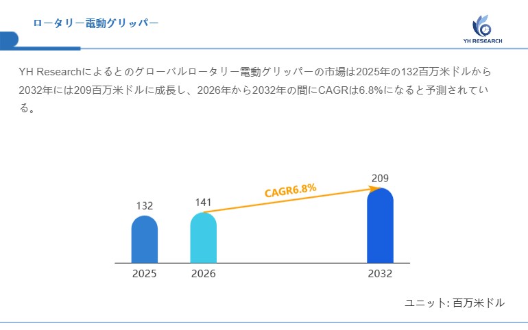YH Researchによるとのグローバルロータリー電動グリッパーの市場は2025年の132百万米ドルから2032年には209百万米ドルに成長し、2026年から2032年の間にCAGRは6.8%になると予測されている。
