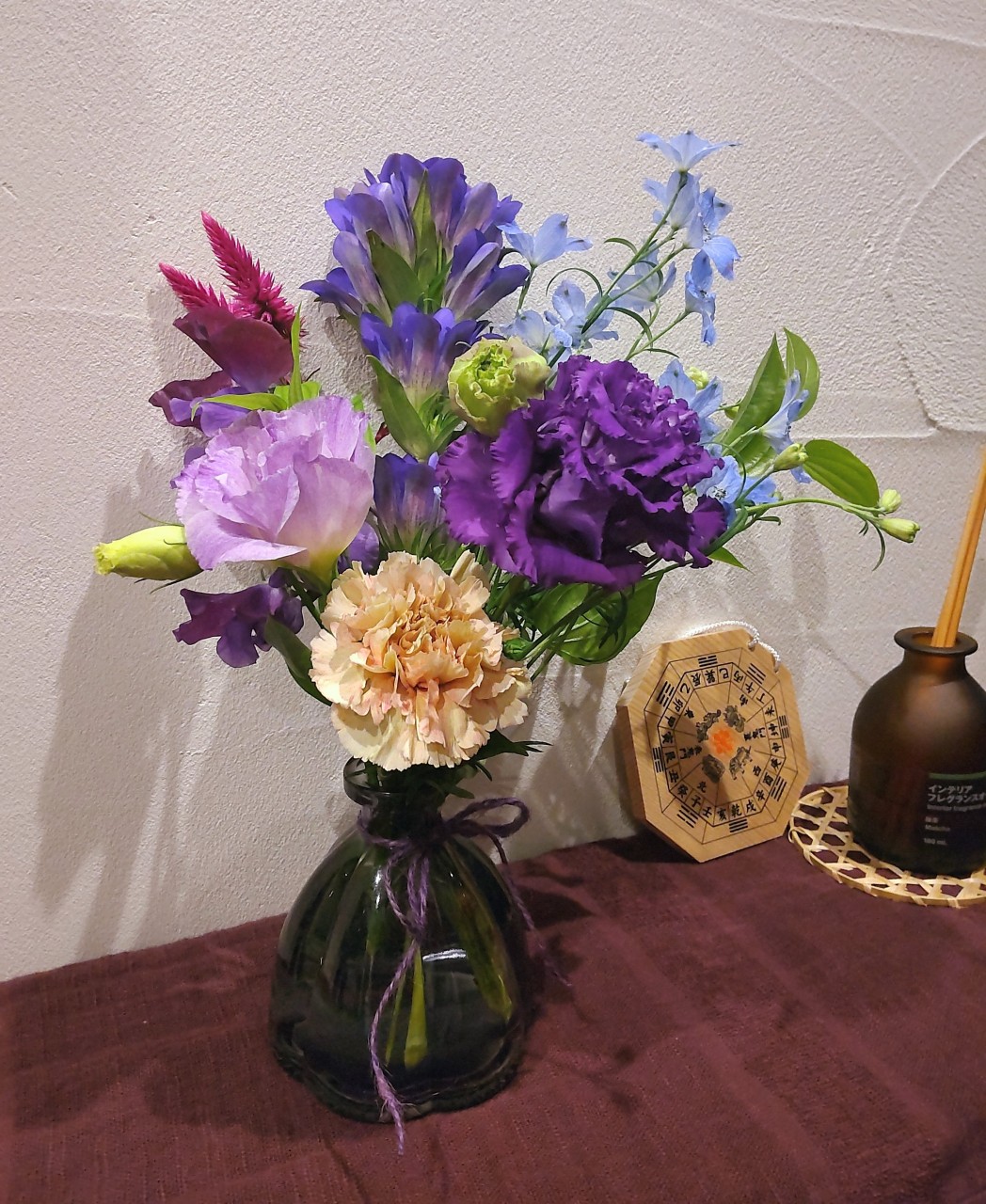 ベージュと濃い紫のカーネーション、青紫の竜胆、薄紫のトルコキキョウ、淡いブルーのデルフィニウム、穂のような赤紫のケイトウ。