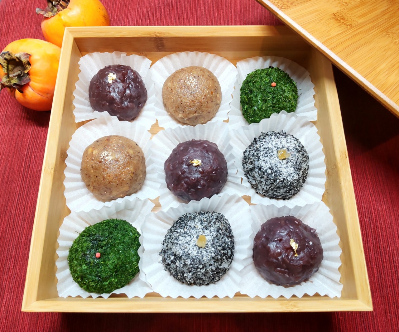 つぶあん・くるみあんの他に、餅米につぶあんをくるんだ黒ごまと青のり。