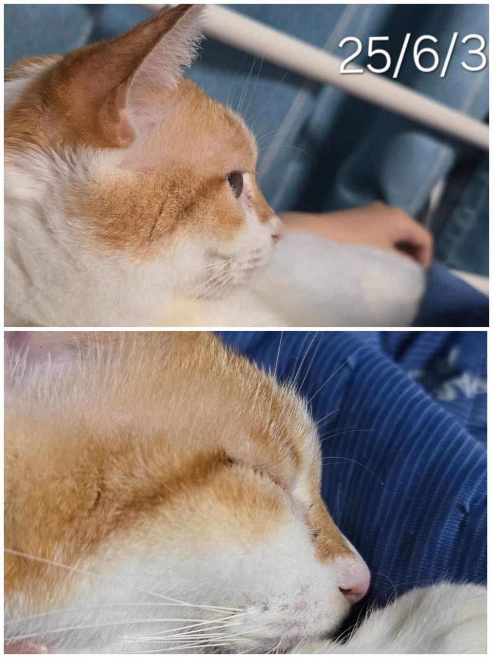 大慌てで他の猫達のおでこを触るも、こんな硬い物はない。ラウちゃんだけに存在している……。必死に過去の写真を見返し、前のスマホの写真も漁れどいつから存在しているのか不明。横向きの写真は変わってないように見える。まだ小さいからかもだけど。(上:25/6/30 下:25/8/28)