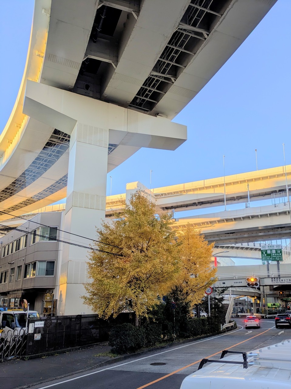 綺麗に黄色くなってるイチョウがあったので撮ってみたら高速道路とか空の方が目立ってしまったwww