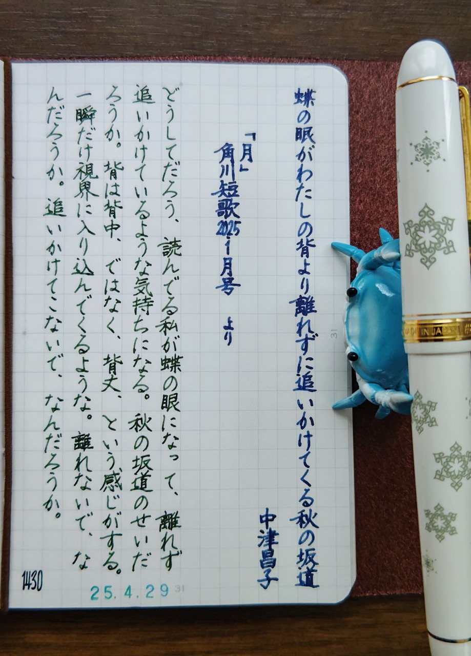 [今日の短歌/中津昌子]蝶の眼がわたしの背より離れずに追いかけてくる秋の坂道