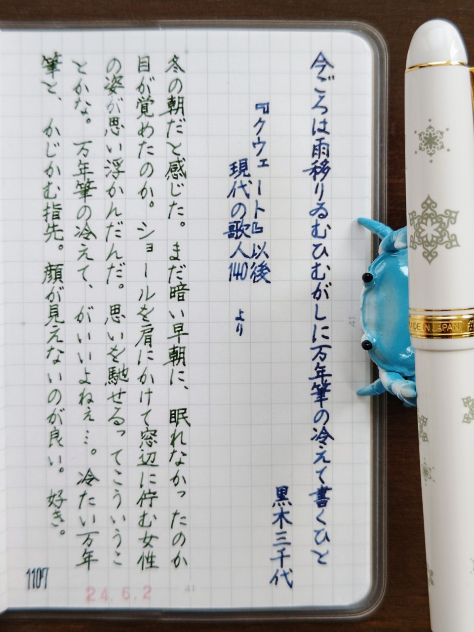 [今日の短歌/黒木三千代]今ごろは雨移りゐむひむがしに万年筆の冷えて書くひと