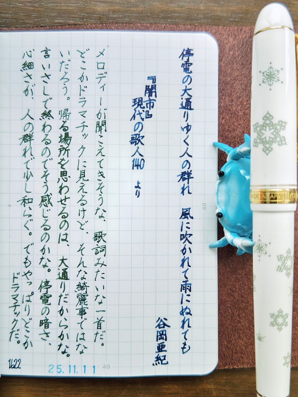 停電の大通りゆく人の群れ 風に吹かれて雨にぬれても/谷岡亜紀