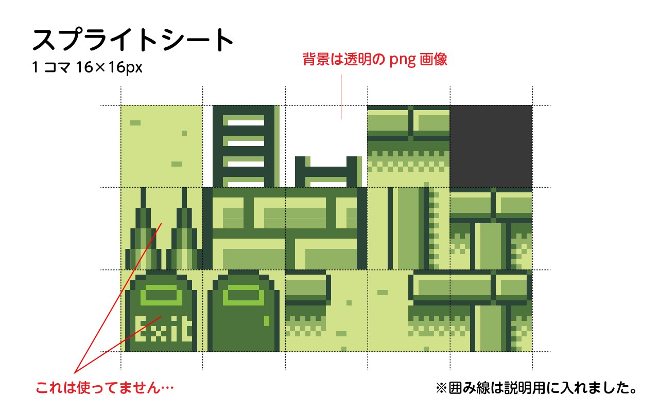 今回はスプライトシートやアバター、モブを自分で作りました。モニスク(プログラム)は使っていません。