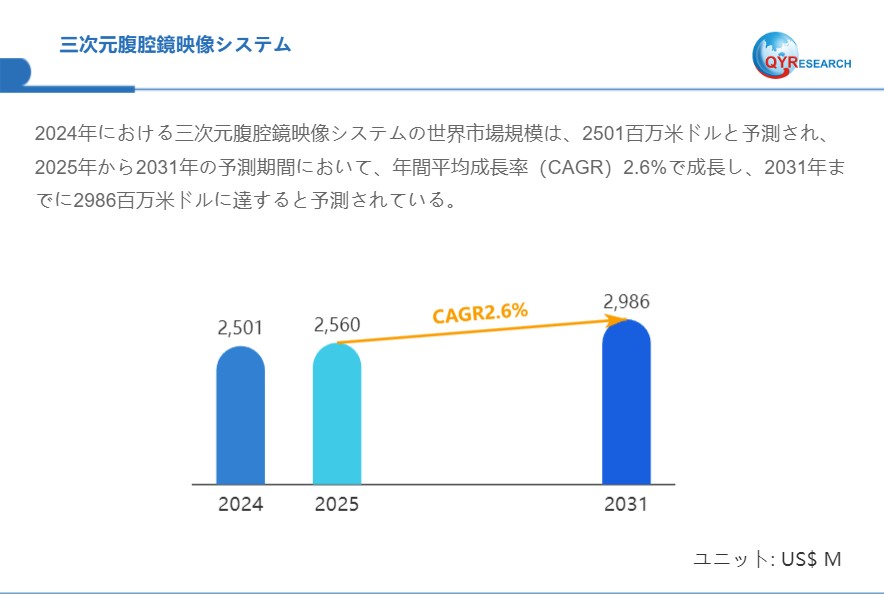 三次元腹腔鏡映像システムの世界市場は、2024年に約2501百万米ドルと推定されており、2025年には2560百万米ドルに達する見通しです。今後は、2025年から2031年にかけて年平均成長率(CAGR)2.6%で成長し、2031年には約2986百万米ドル規模に拡大すると予測されています。