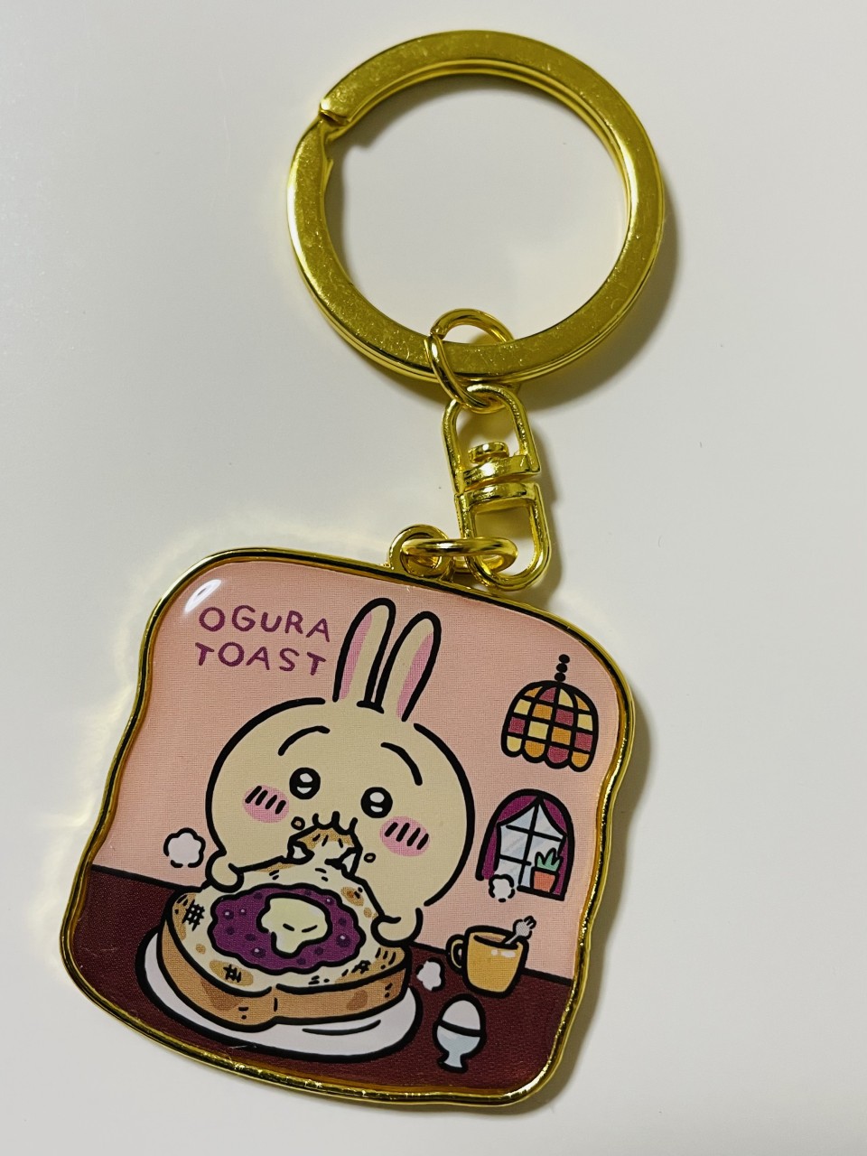 小倉トーストを頬張るちいかわ・ハチワレ・うさぎのかわいいキーホルダーです。